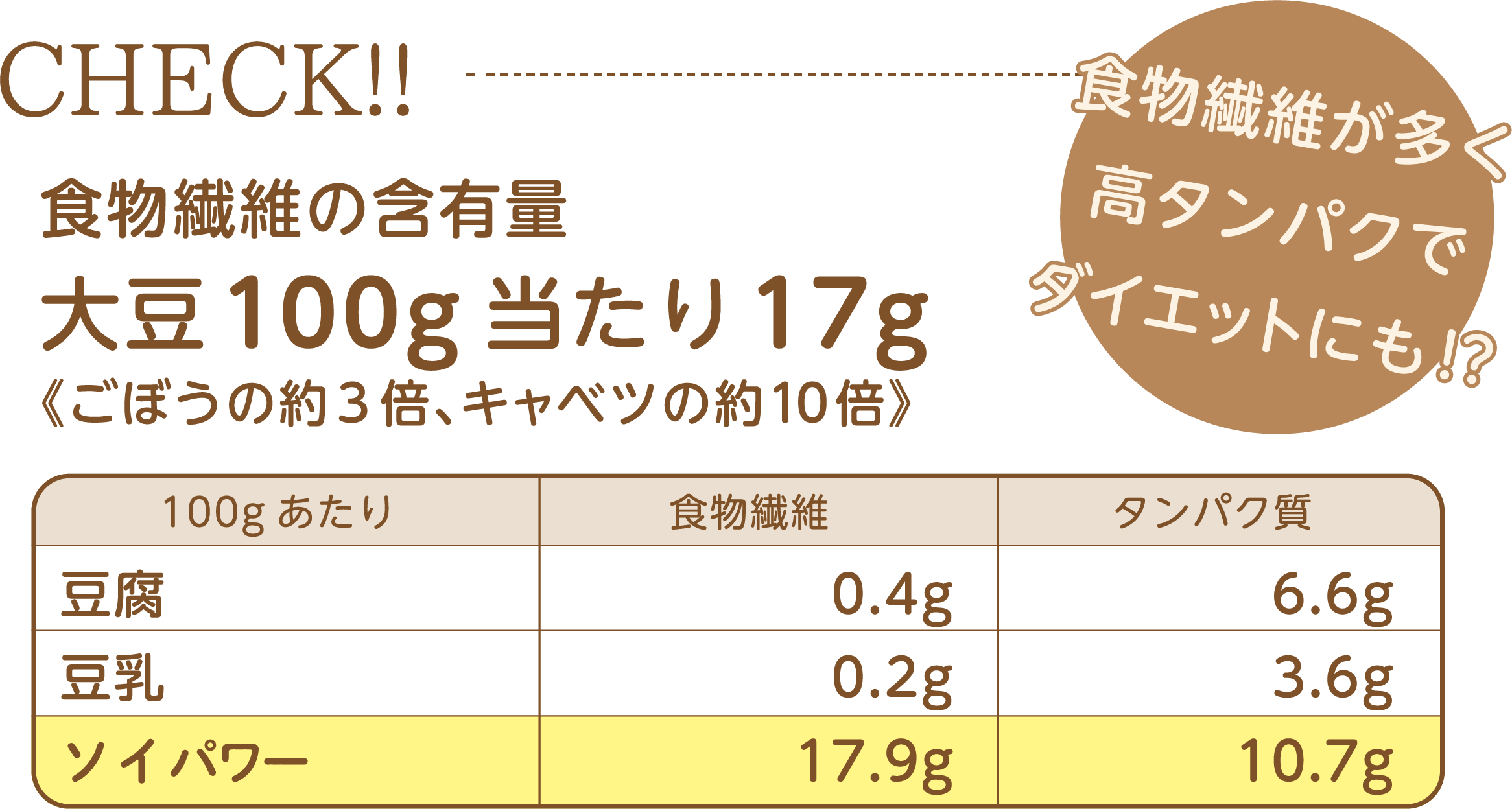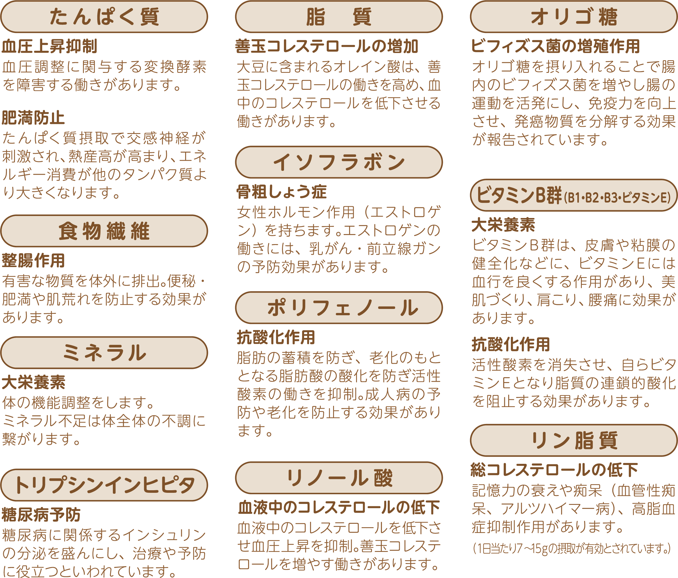 また大豆には炭水化物、脂質、オリゴ糖、食物繊維、ミネラル、ビ
